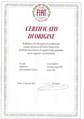 Come confermato dalla sua certificazione originale Fiat Classiche , questa eccezionale coupé fu costruita nell’aprile del 1968 e consegnata nuova a Ragusa, nel sud Italia. Nel giugno del 1969 fu trasferita a Roma, dove rimase per tutta la sua vita.