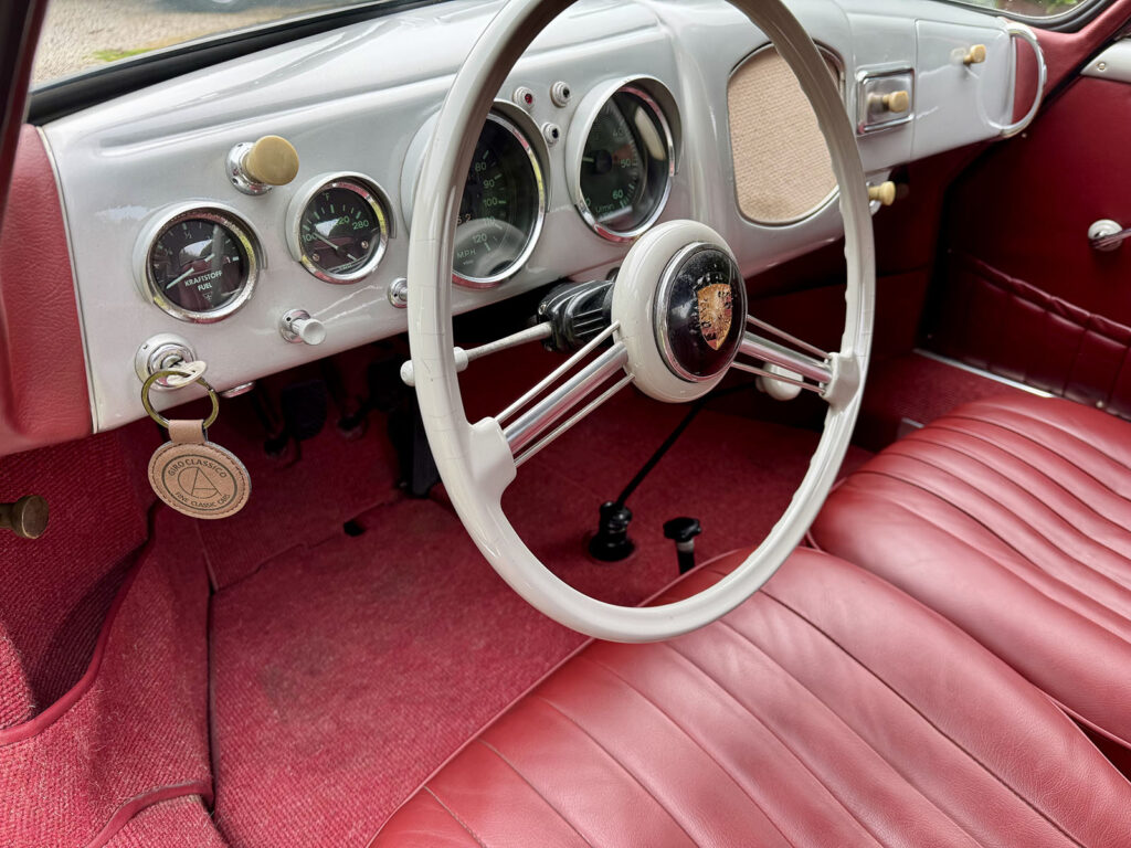 La leggendaria 356 di Ferdinand Porsche vide la luce per la prima volta in una piccola officina a Gmünd, in Austria, nel 1948. L’aumento della domanda portò allo spostamento della produzione a Stoccarda nel 1950, dove le vetture, ora con carrozzeria in acciaio, vennero assemblate dalla Karosserie Reutter. Inizialmente costruita con un parabrezza diviso, nel 1952 lo stile fu perfezionato con un più moderno “finestrino curvo” monoblocco. Questa vettura da noi offerta è l’ultima evoluzione della serie Pre A della Porsche 356 del 1955, prima di passare alla A T-1.