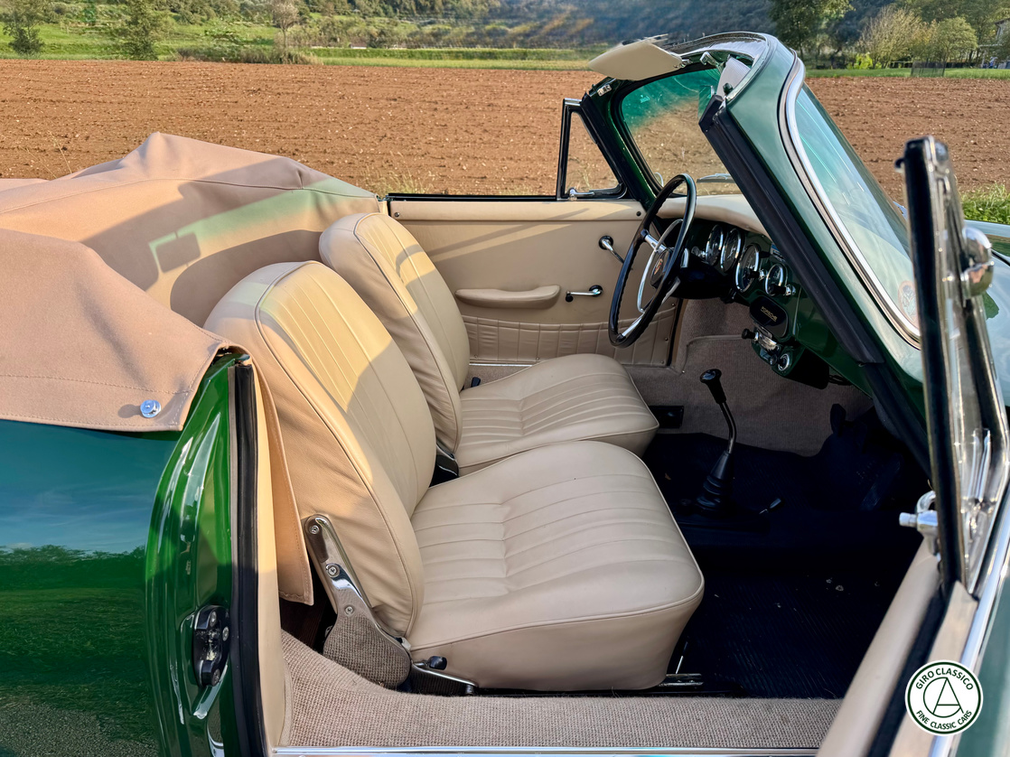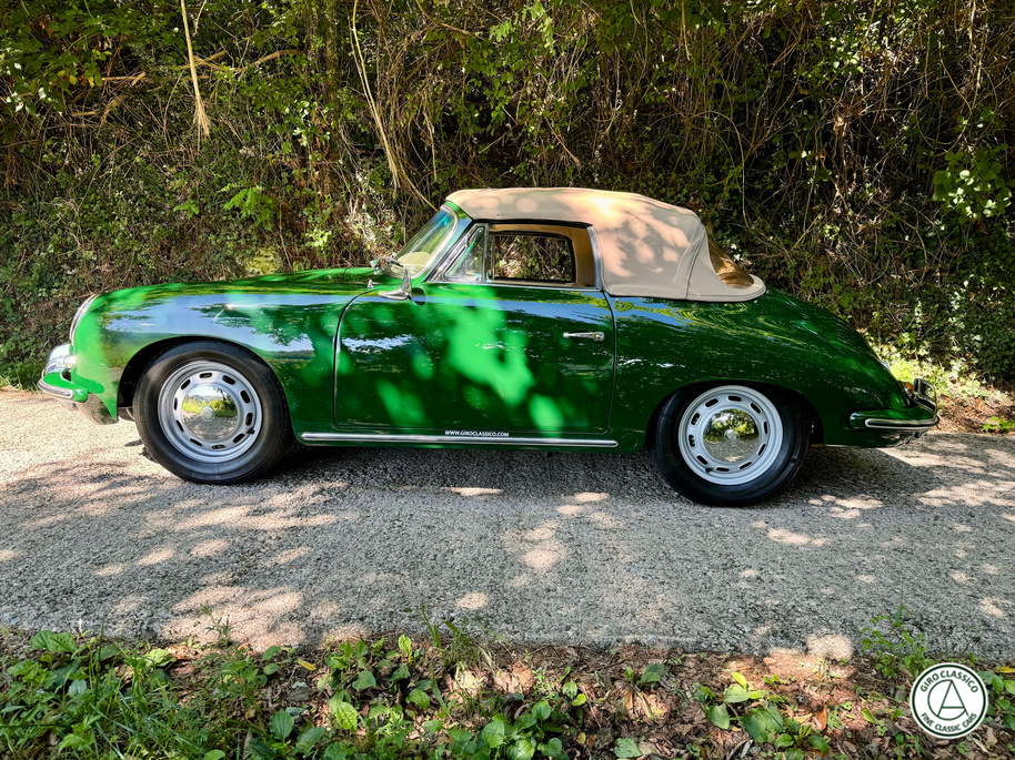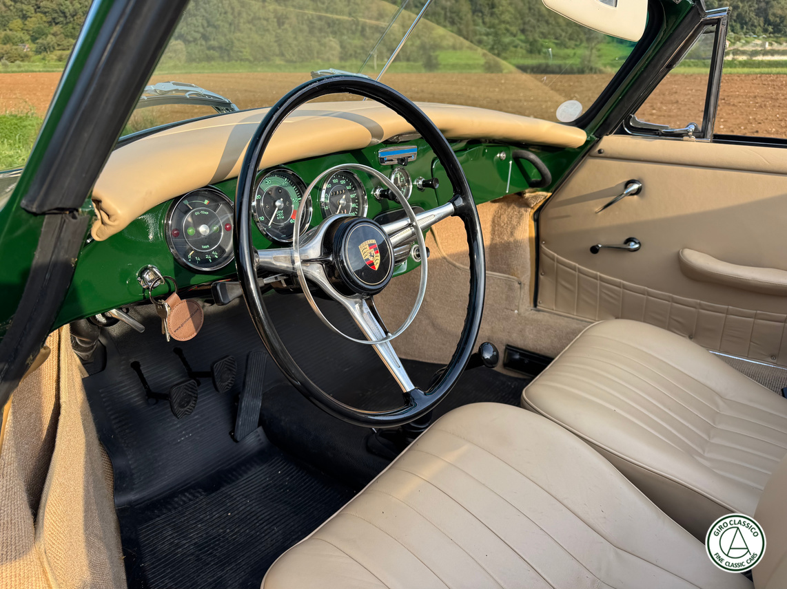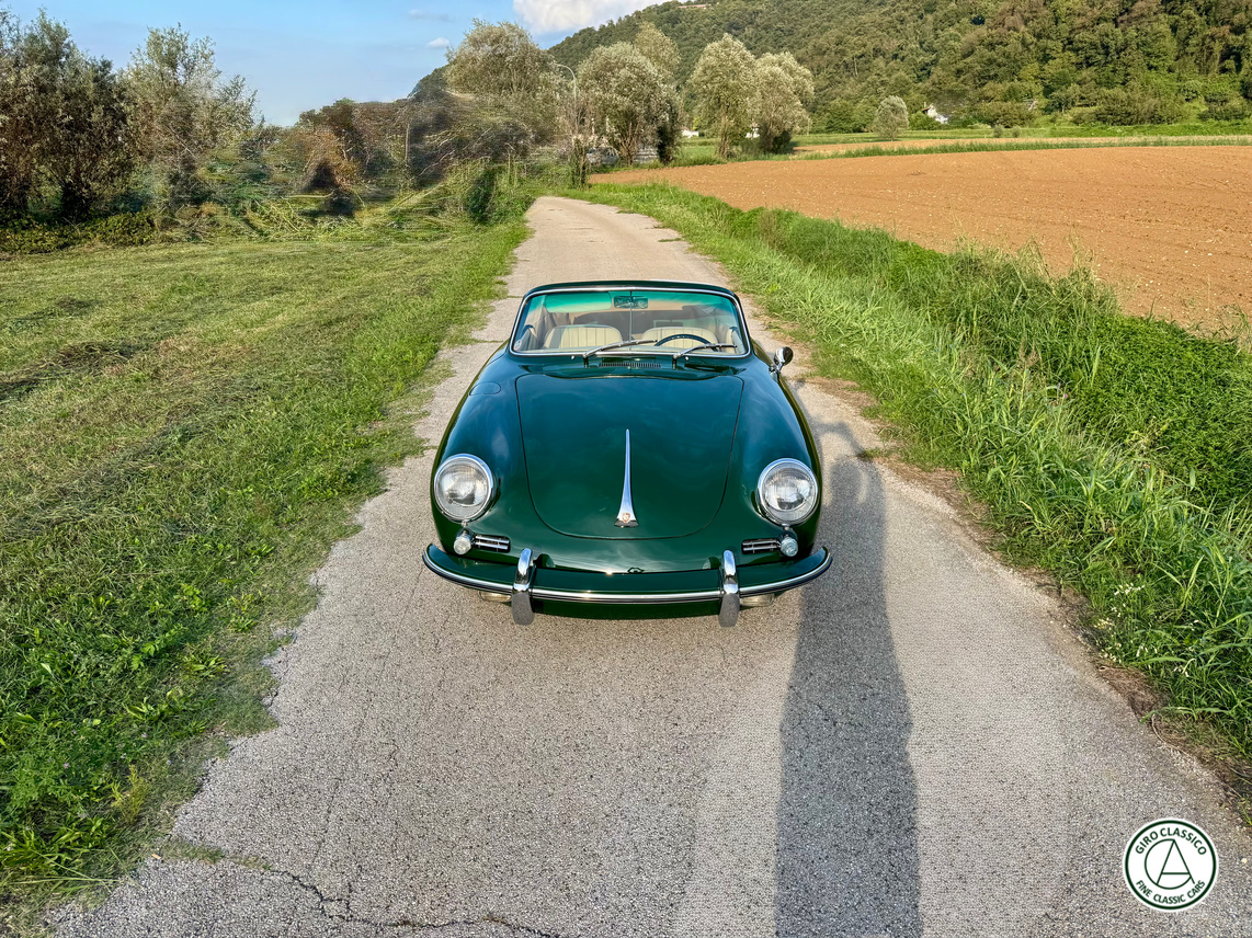 Secondo il certificato Porsche, questa 356 fu lanciata nel 1965 per il mercato interno tedesco, con la specifica di colore Irish grün e rivestimenti in pelle nera. Oggi l’auto è presentata nel suo colore originale Irish grün, ma per i rivestimenti è stata scelta una pelle beige.