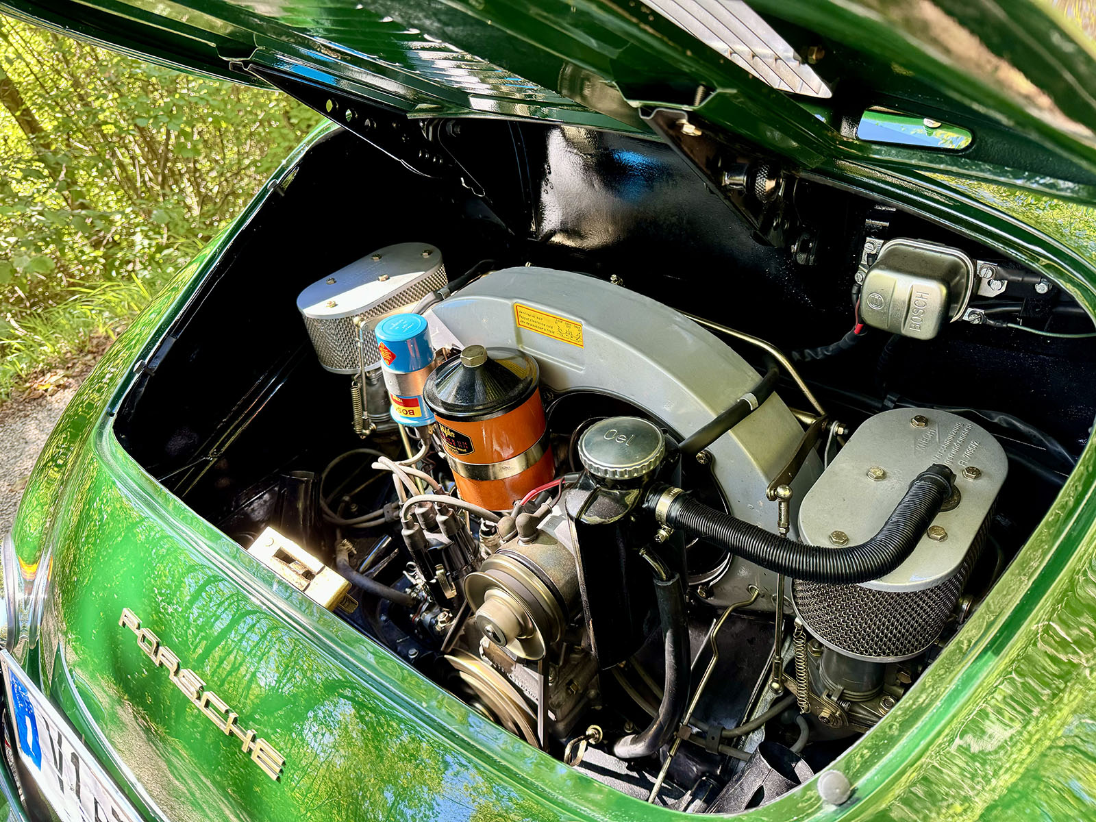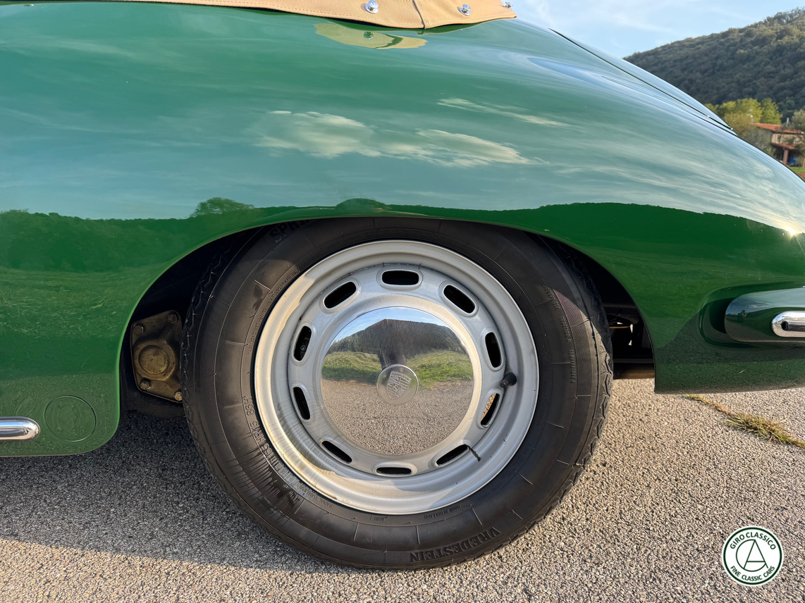 According to the Porsche certificate, this 356 was released in 1965 for the German domestic market, with the color specification Irish grün and black leather upholstery. Today the car is presented in its original Irish grün color but for the upholstery a beige leather was chosen.