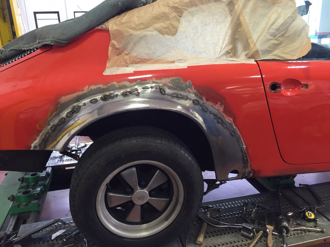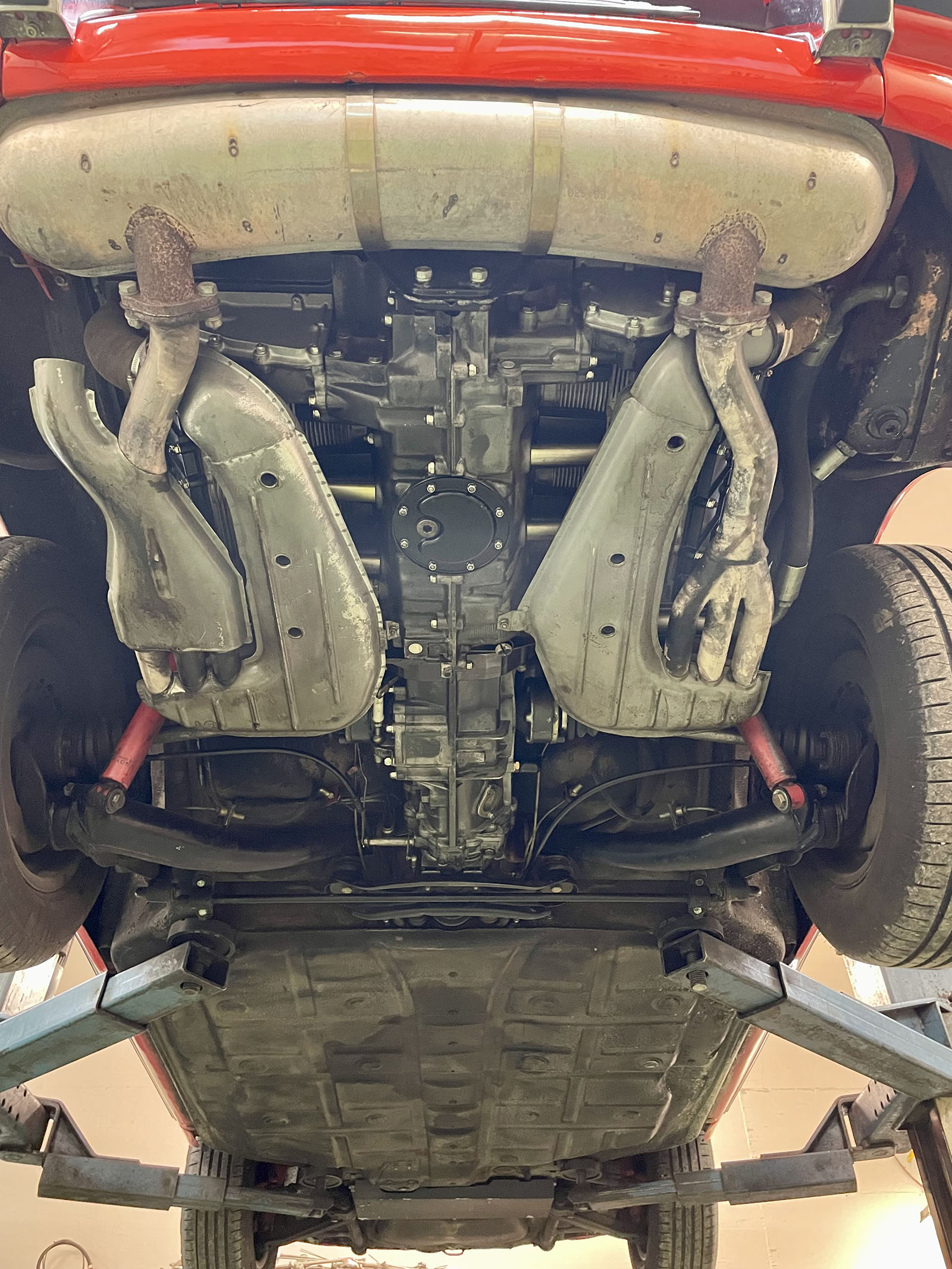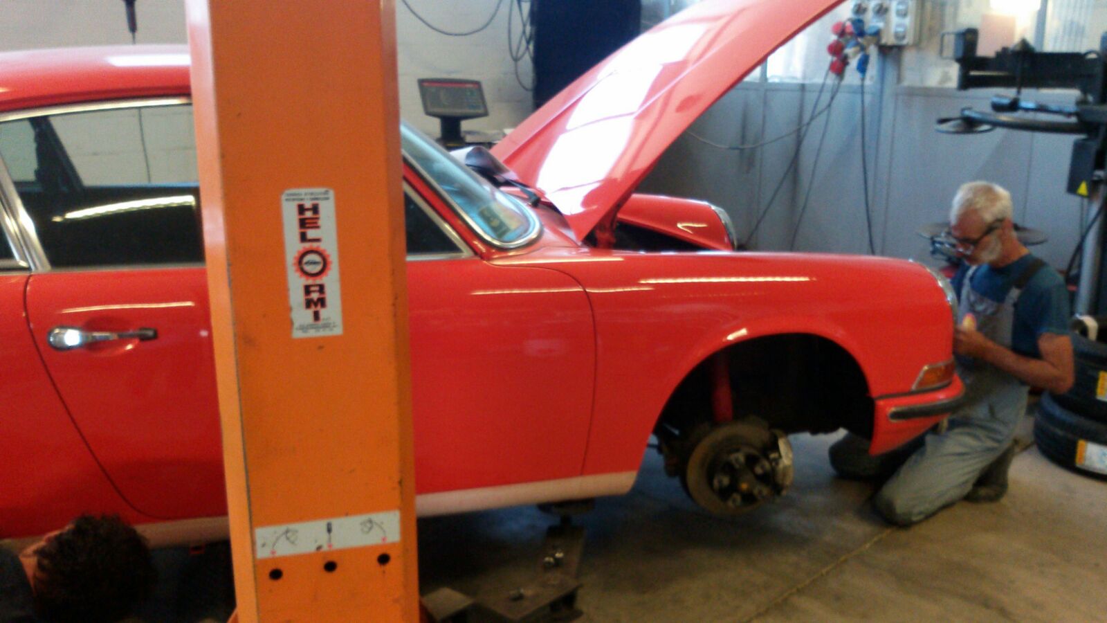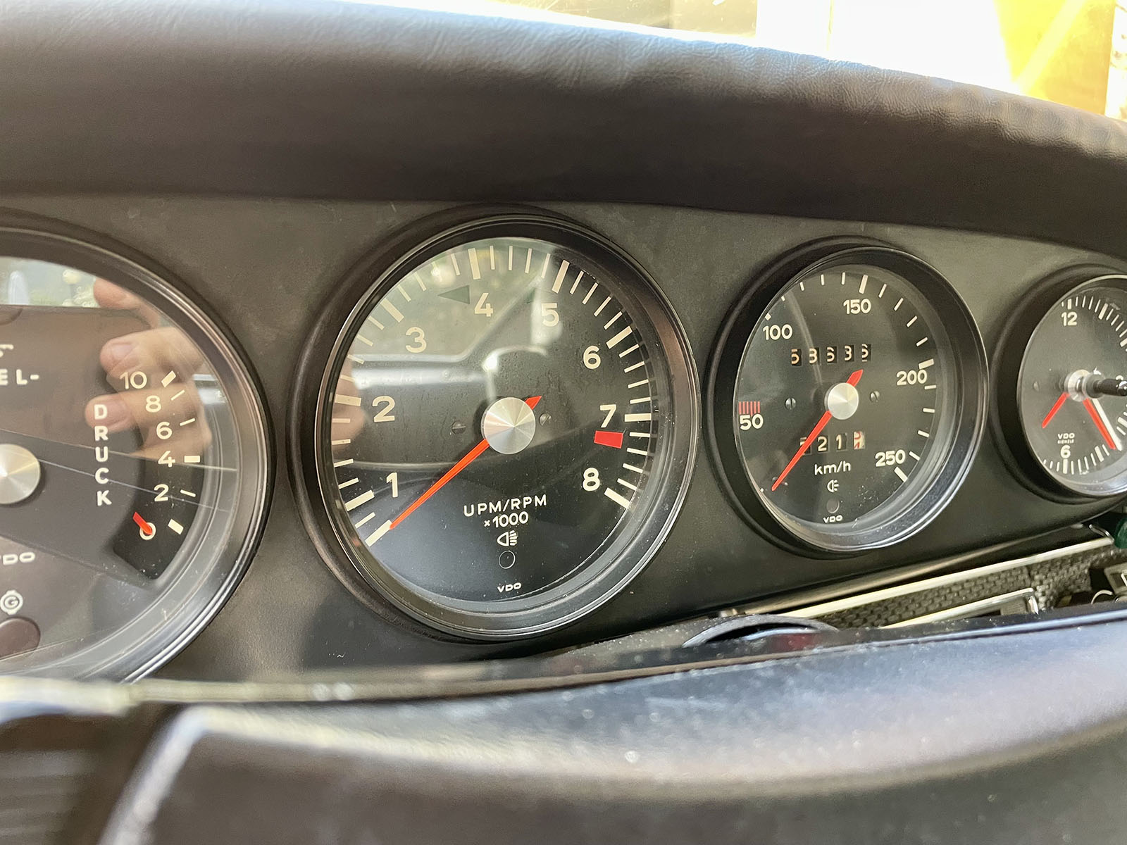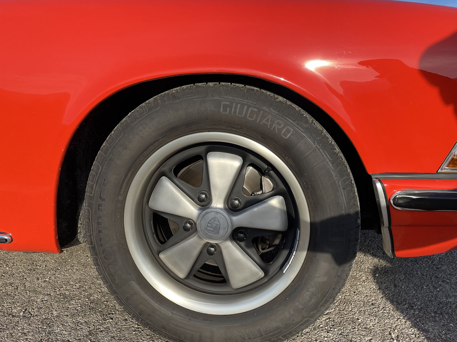 Mechanically, the original, matching-numbers, 2,195-cubic centimeter Type 911/02 flat-six engine and Type 911/01 transaxle were completely overhauled, and the engine compartment was detailed to its factory appearance. The 6×15 Fuchs forged alloy wheels were polished and repainted, and suspension parts, such as the shock absorbers, tie-rod ends, ball joints, and bushings, were replaced, as needed, with correct new parts.